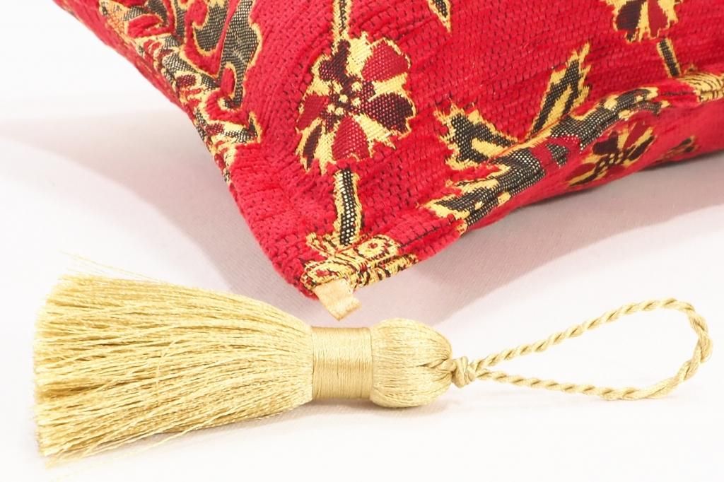 お洗濯の際にタッセルを取り外しできるよう作りました。タッセルを専門に作っている会社にオーダーしておりますが、当店のすべてのタッセルをひとりの職人が手作りしております。ポリエステルの3000本の糸を使用し、全長13センチ、1センチの結び目は約80センチの糸7本を使ってしっかり止めていますので、ほどけにくいつくりになっております。糸もファブリックのゴールド部分の色に合わせて染色してもらいました。