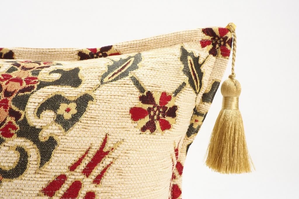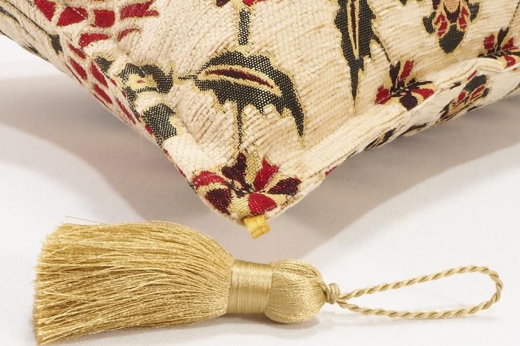お洗濯の際にタッセルを取り外しできるよう作りました。タッセルを専門に作っている会社にオーダーしておりますが、当店のすべてのタッセルをひとりの職人が手作りしております。ポリエステルの3000本の糸を使用し、全長13センチ、1センチの結び目は約80センチの糸7本を使ってしっかり止めていますので、ほどけにくいつくりになっております。糸もファブリックのゴールド部分の色に合わせて染色してもらいました。