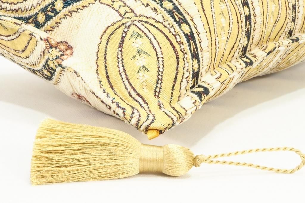 お洗濯の際にタッセルを取り外しできるよう作りました。タッセルを専門に作っている会社にオーダーしておりますが、当店のすべてのタッセルをひとりの職人が手作りしております。ポリエステルの3000本の糸を使用し、全長13センチ、1センチの結び目は約80センチの糸7本を使ってしっかり止めていますので、ほどけにくいつくりになっております。糸もファブリックのゴールド部分の色に合わせて染色してもらいました。