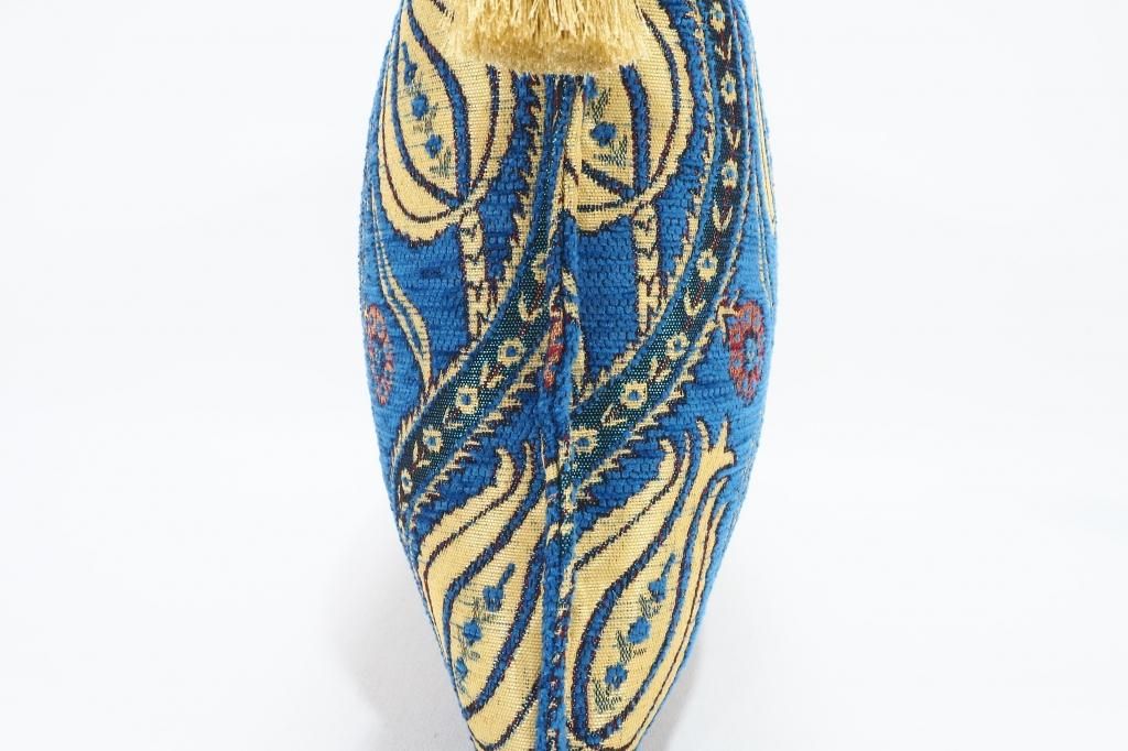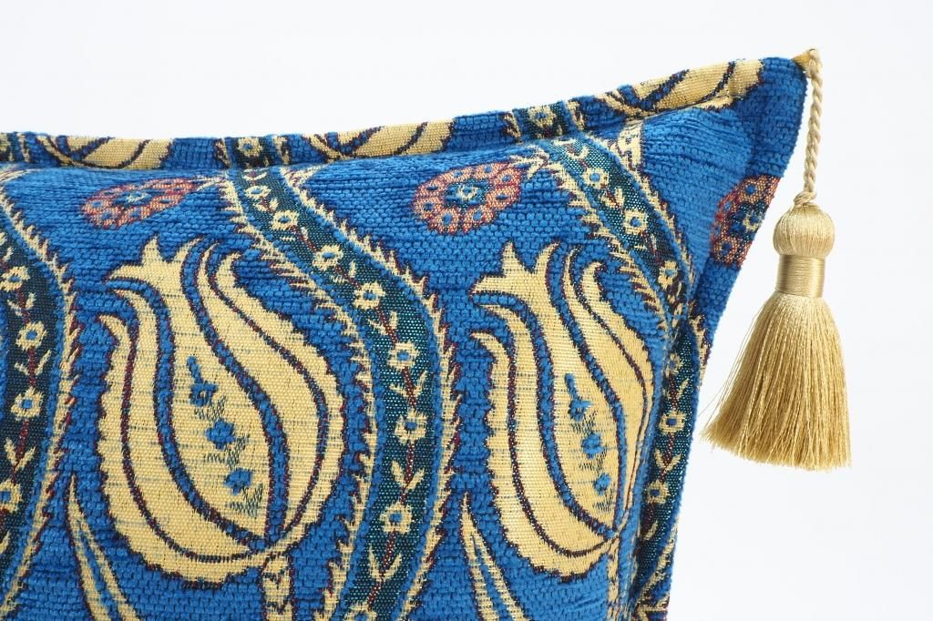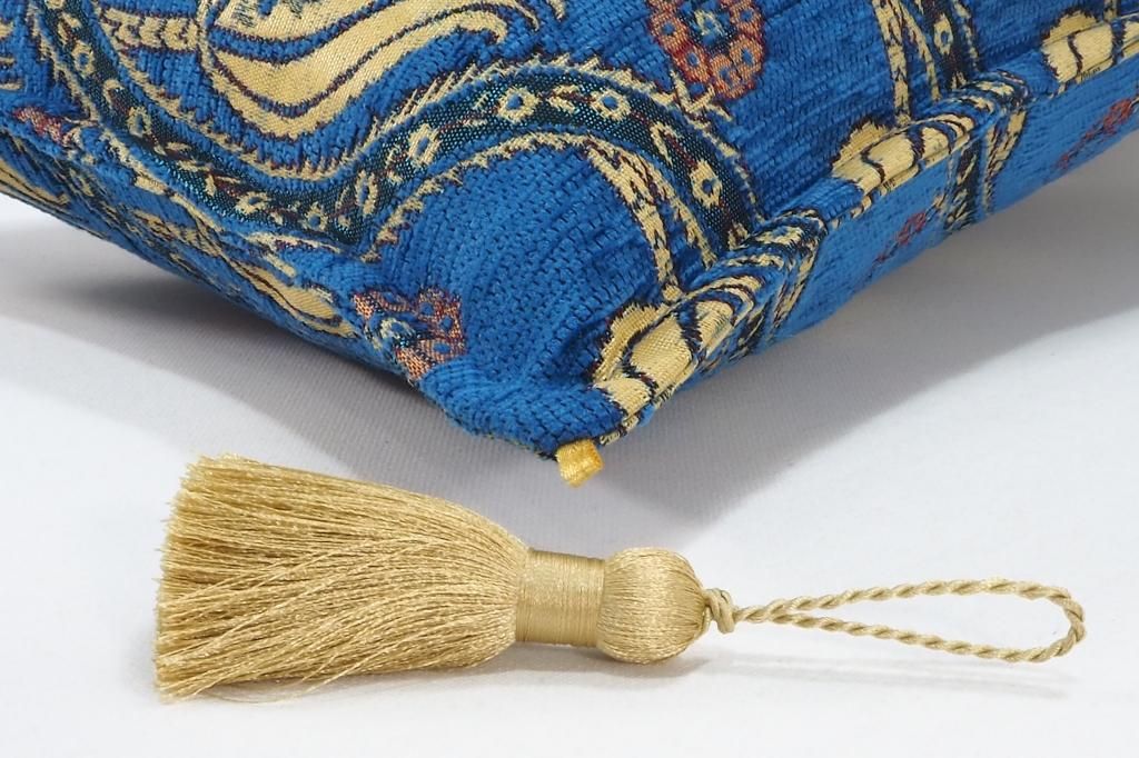 お洗濯の際にタッセルを取り外しできるよう作りました。タッセルを専門に作っている会社にオーダーしておりますが、当店のすべてのタッセルをひとりの職人が手作りしております。ポリエステルの3000本の糸を使用し、全長13センチ、1センチの結び目は約80センチの糸7本を使ってしっかり止めていますので、ほどけにくいつくりになっております。糸もファブリックのゴールド部分の色に合わせて染色してもらいました。