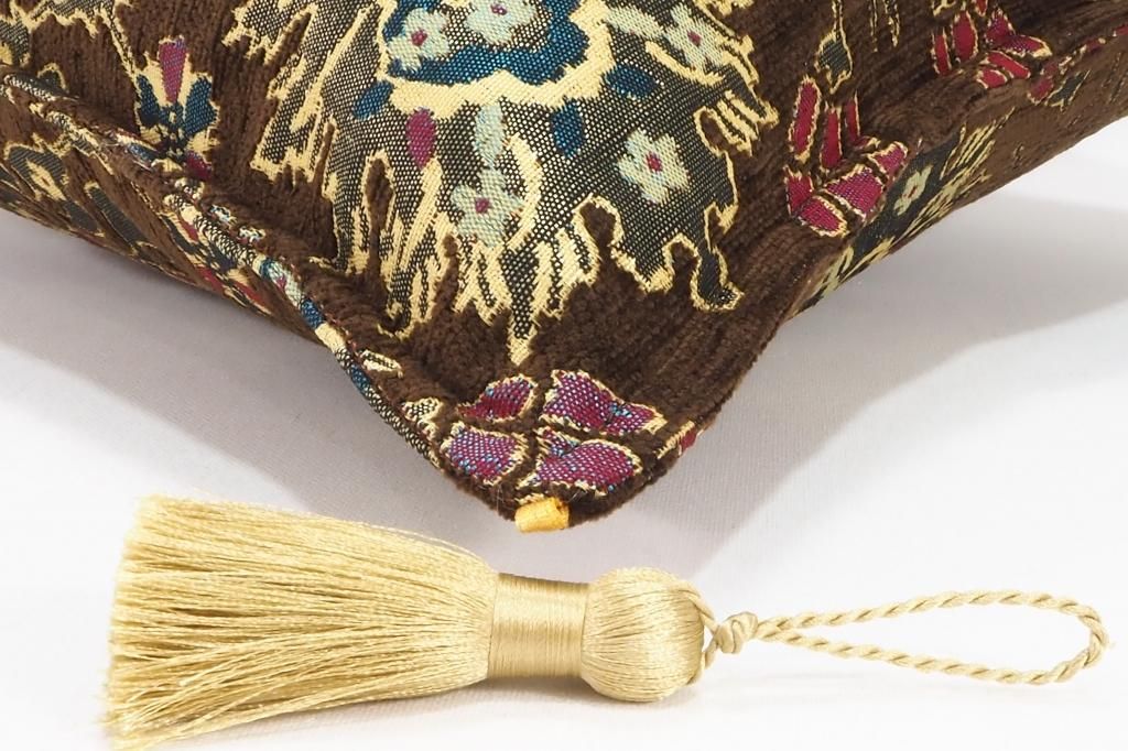 お洗濯の際にタッセルを取り外しできるよう作りました。タッセルを専門に作っている会社にオーダーしておりますが、当店のすべてのタッセルをひとりの職人が手作りしております。ポリエステルの3000本の糸を使用し、全長13センチ、1センチの結び目は約80センチの糸7本を使ってしっかり止めていますので、ほどけにくいつくりになっております。糸もファブリックのゴールド部分の色に合わせて染色してもらいました。