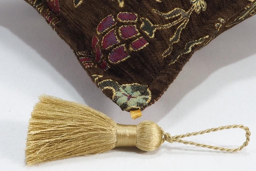 お洗濯の際にタッセルを取り外しできるよう作りました。タッセルを専門に作っている会社にオーダーしておりますが、当店のすべてのタッセルをひとりの職人が手作りしております。ポリエステルの3000本の糸を使用し、全長13センチ、1センチの結び目は約80センチの糸7本を使ってしっかり止めていますので、ほどけにくいつくりになっております。糸もファブリックのゴールド部分の色に合わせて染色してもらいました。