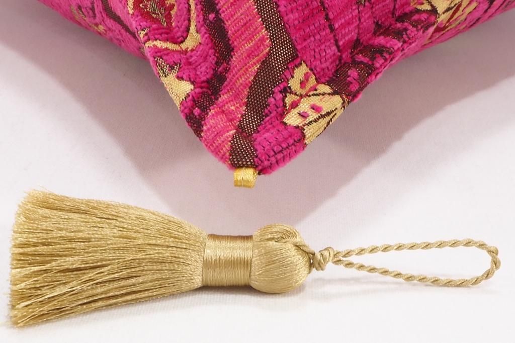お洗濯の際にタッセルを取り外しできるよう作りました。タッセルを専門に作っている会社にオーダーしておりますが、当店のすべてのタッセルをひとりの職人が手作りしております。ポリエステルの3000本の糸を使用し、全長13センチ、1センチの結び目は約80センチの糸7本を使ってしっかり止めていますので、ほどけにくいつくりになっております。糸もファブリックのゴールド部分の色に合わせて染色してもらいました。
