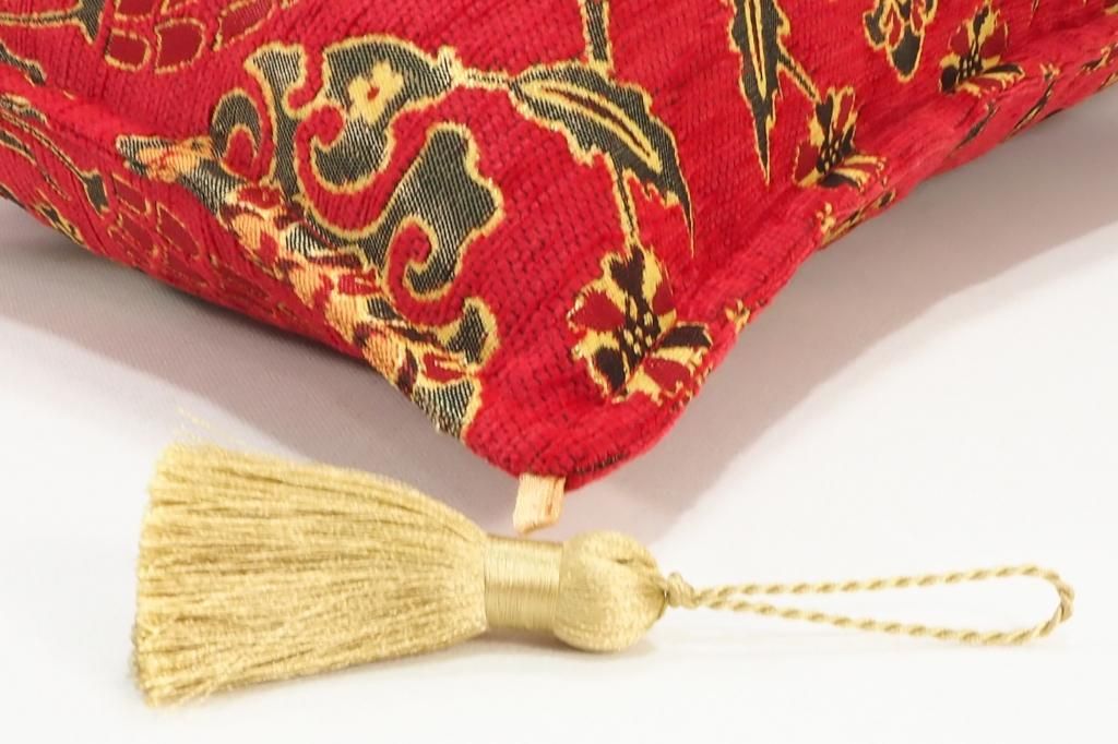 お洗濯の際にタッセルを取り外しできるよう作りました。タッセルを専門に作っている会社にオーダーしておりますが、当店のすべてのタッセルをひとりの職人が手作りしております。ポリエステルの3000本の糸を使用し、全長13センチ、1センチの結び目は約80センチの糸7本を使ってしっかり止めていますので、ほどけにくいつくりになっております。糸もファブリックのゴールド部分の色に合わせて染色してもらいました。