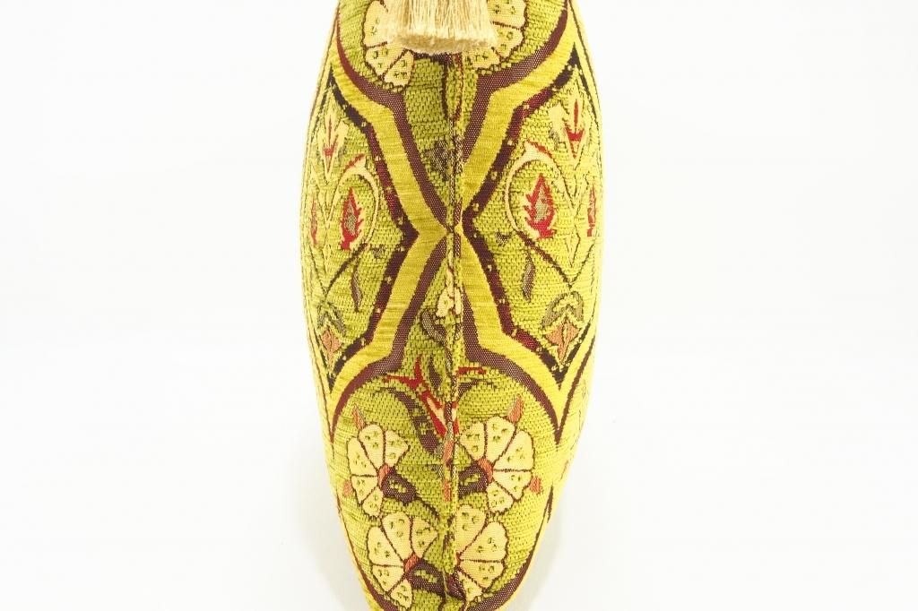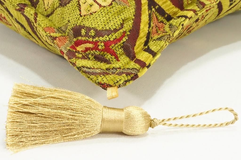 お洗濯の際にタッセルを取り外しできるよう作りました。タッセルを専門に作っている会社にオーダーしておりますが、当店のすべてのタッセルをひとりの職人が手作りしております。ポリエステルの3000本の糸を使用し、全長13センチ、1センチの結び目は約80センチの糸7本を使ってしっかり止めていますので、ほどけにくいつくりになっております。糸もファブリックのゴールド部分の色に合わせて染色してもらいました。