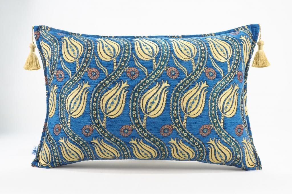 トルコファブリッククッション60x40cm ターコイズブルー モロッコシェイプチューリップデザイン