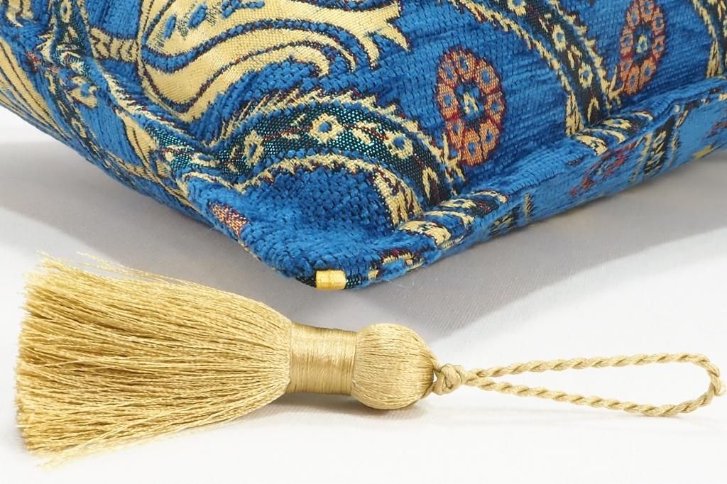 お洗濯の際にタッセルを取り外しできるよう作りました。タッセルを専門に作っている会社にオーダーしておりますが、当店のすべてのタッセルをひとりの職人が手作りしております。ポリエステルの3000本の糸を使用し、全長13センチ、1センチの結び目は約80センチの糸7本を使ってしっかり止めていますので、ほどけにくいつくりになっております。糸もファブリックのゴールド部分の色に合わせて染色してもらいました。