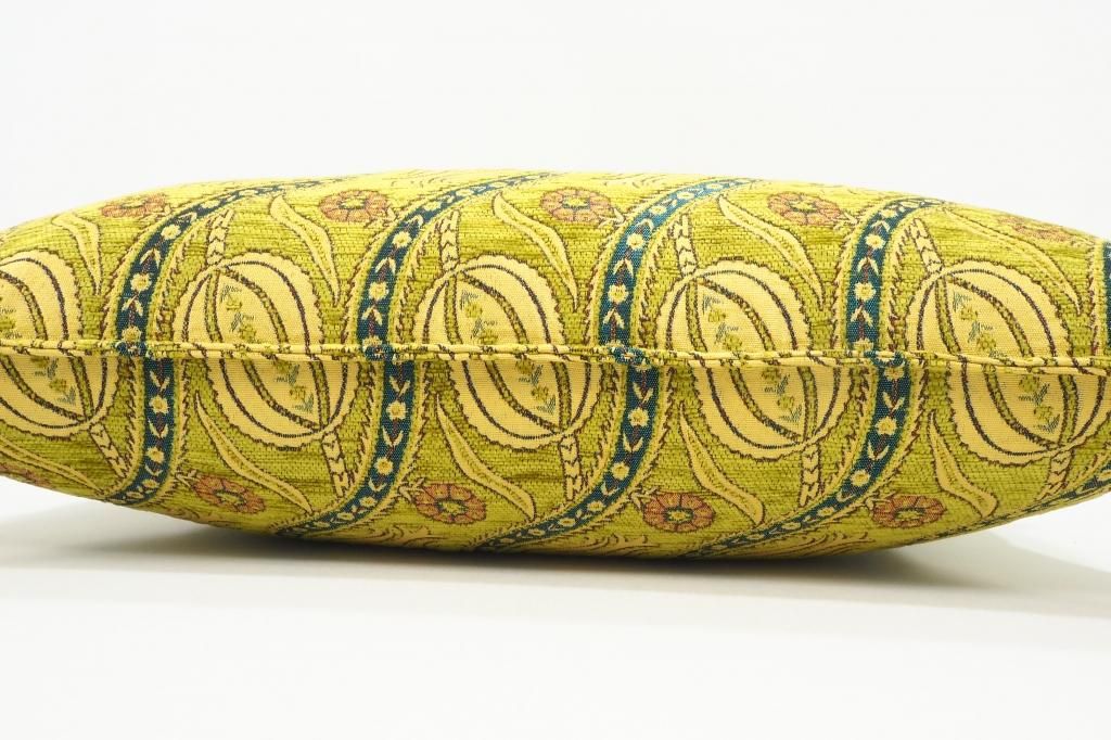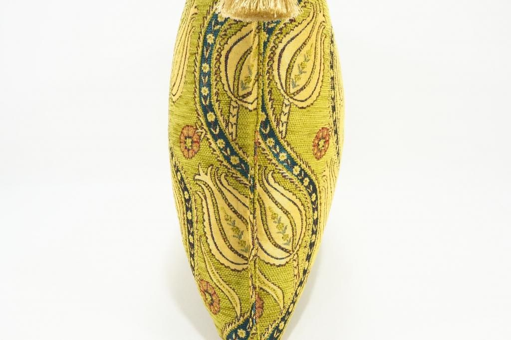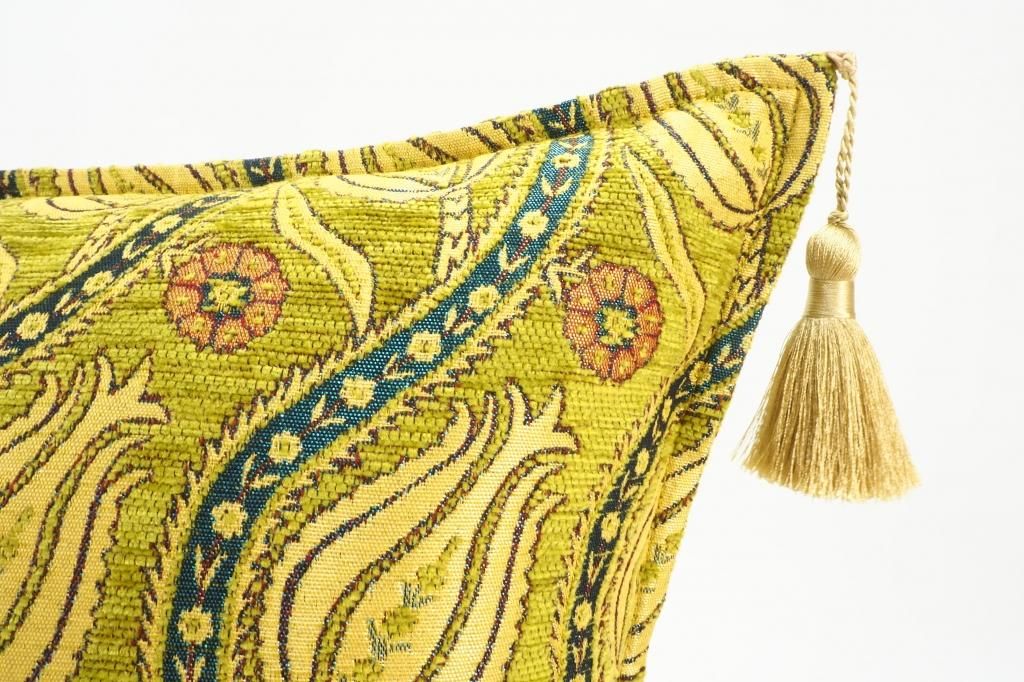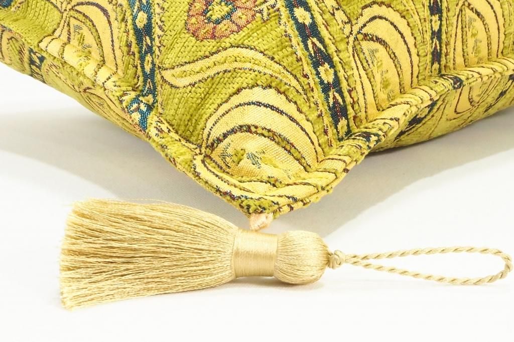 お洗濯の際にタッセルを取り外しできるよう作りました。タッセルを専門に作っている会社にオーダーしておりますが、当店のすべてのタッセルをひとりの職人が手作りしております。ポリエステルの3000本の糸を使用し、全長13センチ、1センチの結び目は約80センチの糸7本を使ってしっかり止めていますので、ほどけにくいつくりになっております。糸もファブリックのゴールド部分の色に合わせて染色してもらいました。