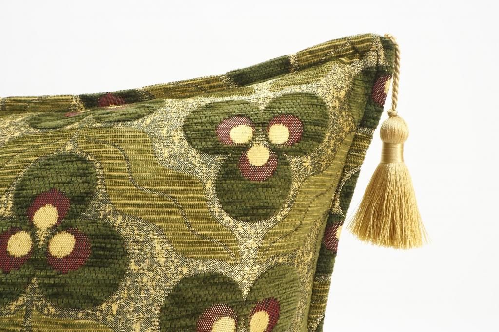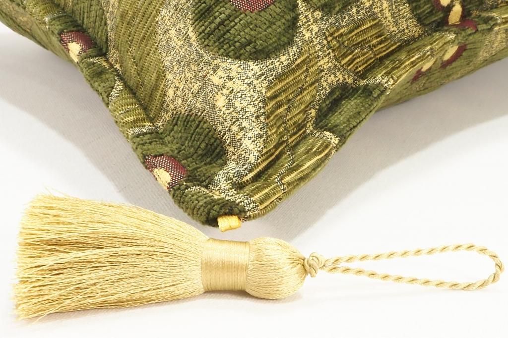 お洗濯の際にタッセルを取り外しできるよう作りました。タッセルを専門に作っている会社にオーダーしておりますが、当店のすべてのタッセルをひとりの職人が手作りしております。ポリエステルの3000本の糸を使用し、全長13センチ、1センチの結び目は約80センチの糸7本を使ってしっかり止めていますので、ほどけにくいつくりになっております。糸もファブリックのゴールド部分の色に合わせて染色してもらいました。